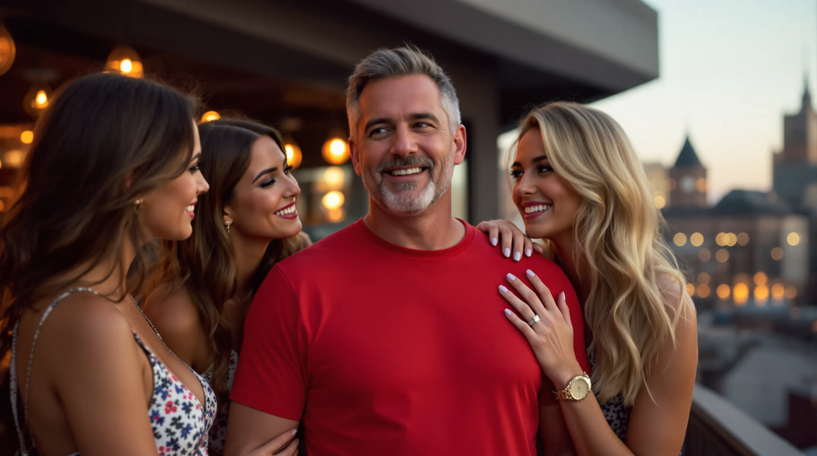 But in the corner, something unusual was happening. A man who looked like he could be anyone's neighbor — average height, wearing a simple red t-shirt, nothing particularly striking about him — was surrounded by three stunning women, all leaning in, laughing, completely captivated.