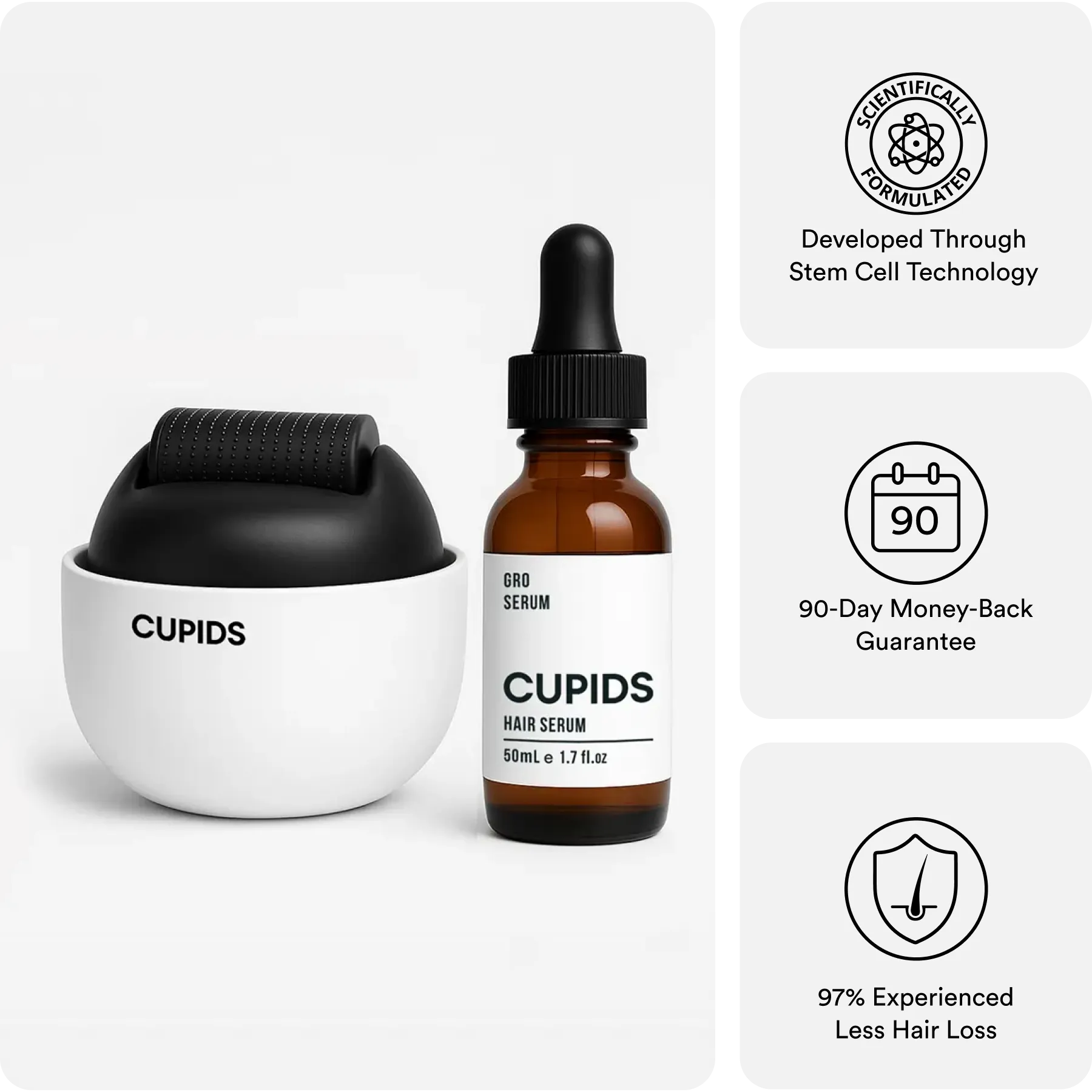 For optimal hair growth, use the Gro® Roller every third day and apply the Gro® Serum daily.